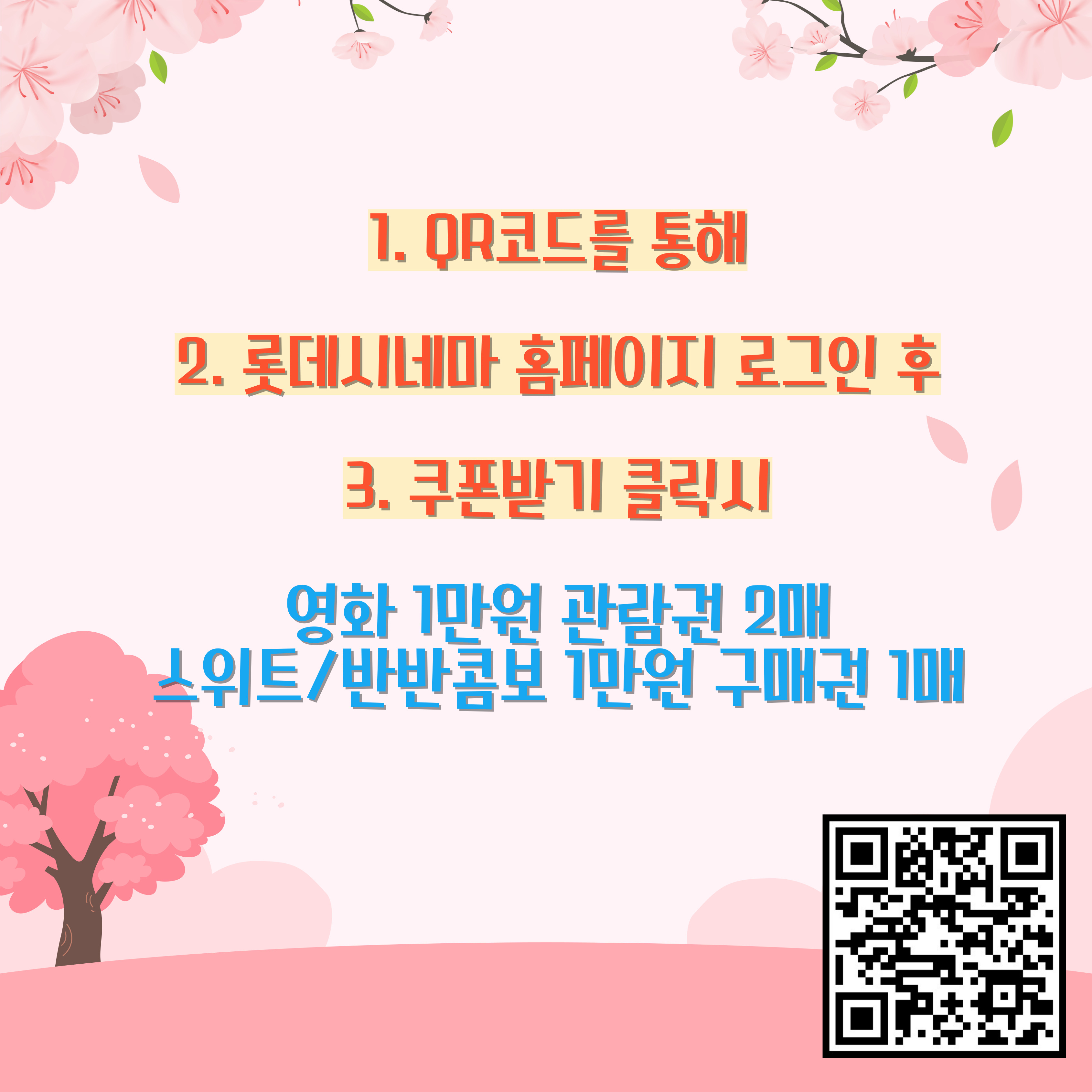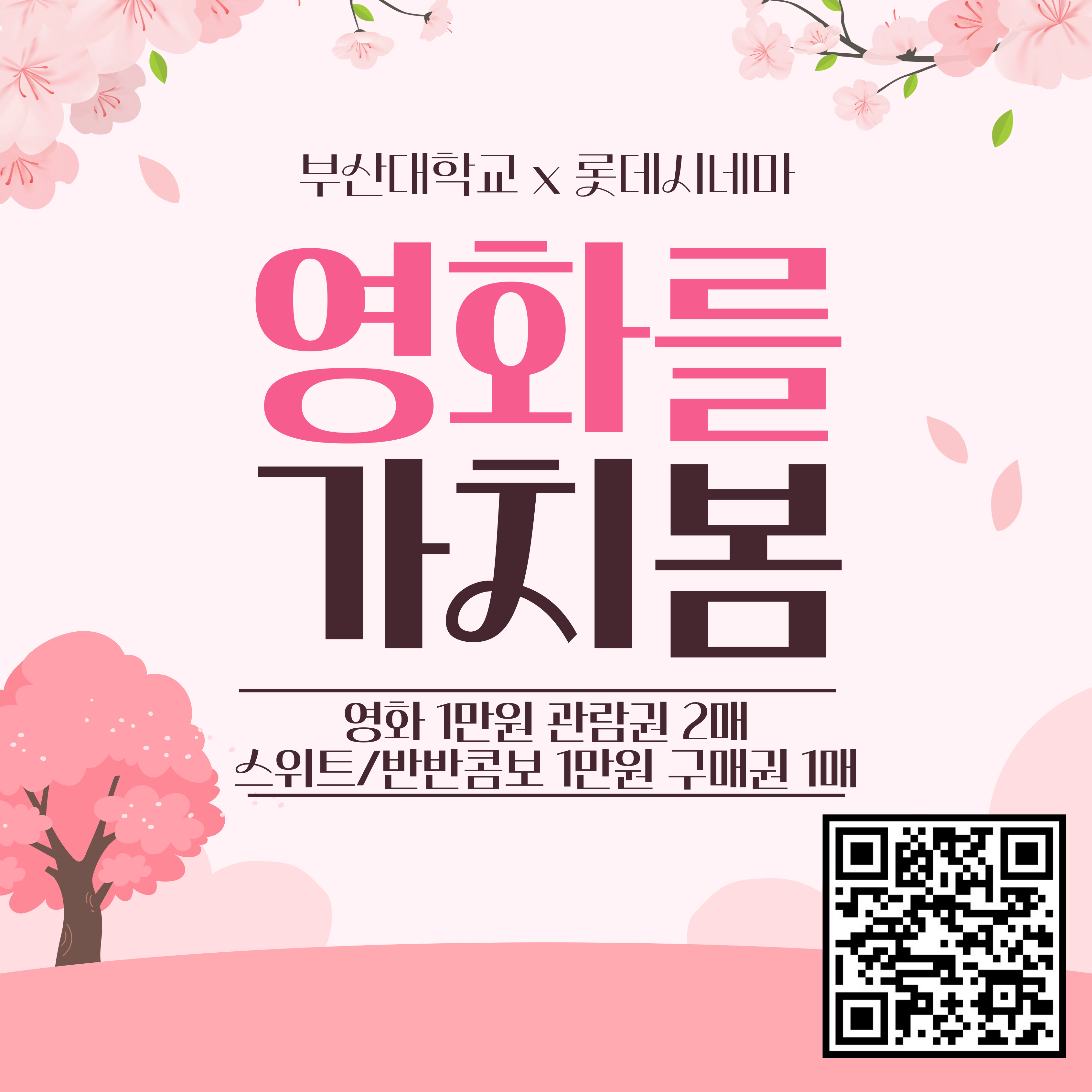 안녕하십니까, 부산대학교 제57대 총학생회 ‘Around Us’ 대외협력국입니다.부산대학교 학생 대상 롯데시네마 할인 혜택 안내 드립니다:)?롯데시네마 전국 직영관 사용 가능?쿠폰 유효기간 : ‘25년 12월 31일(수)까지?상세 사항은 QR코드로 접속한 홈페이지의 유의사항을 참고해주세요.게시물 담당자: 대외협력국장 박성빈게시물 책임자: 총학생회장 최수인