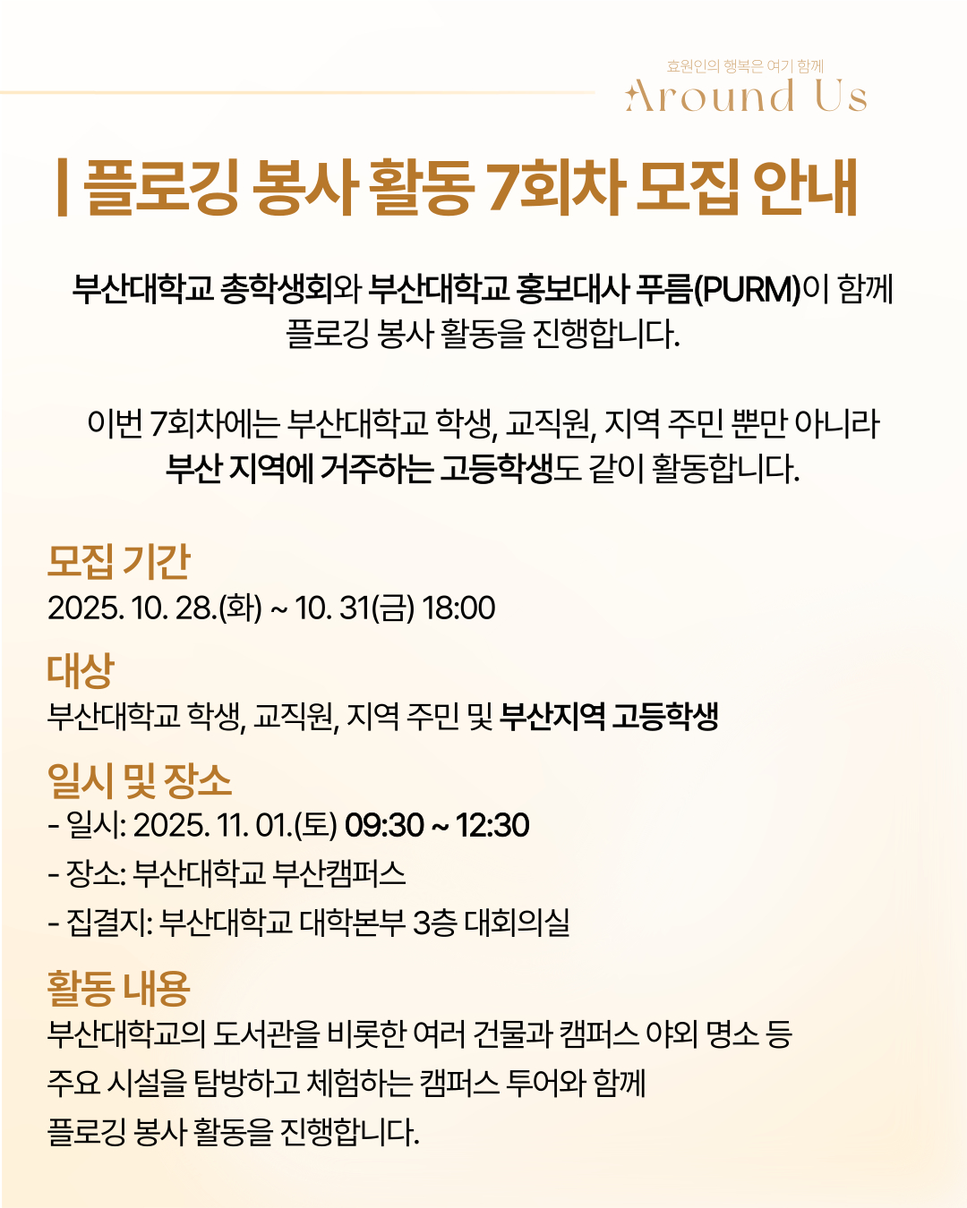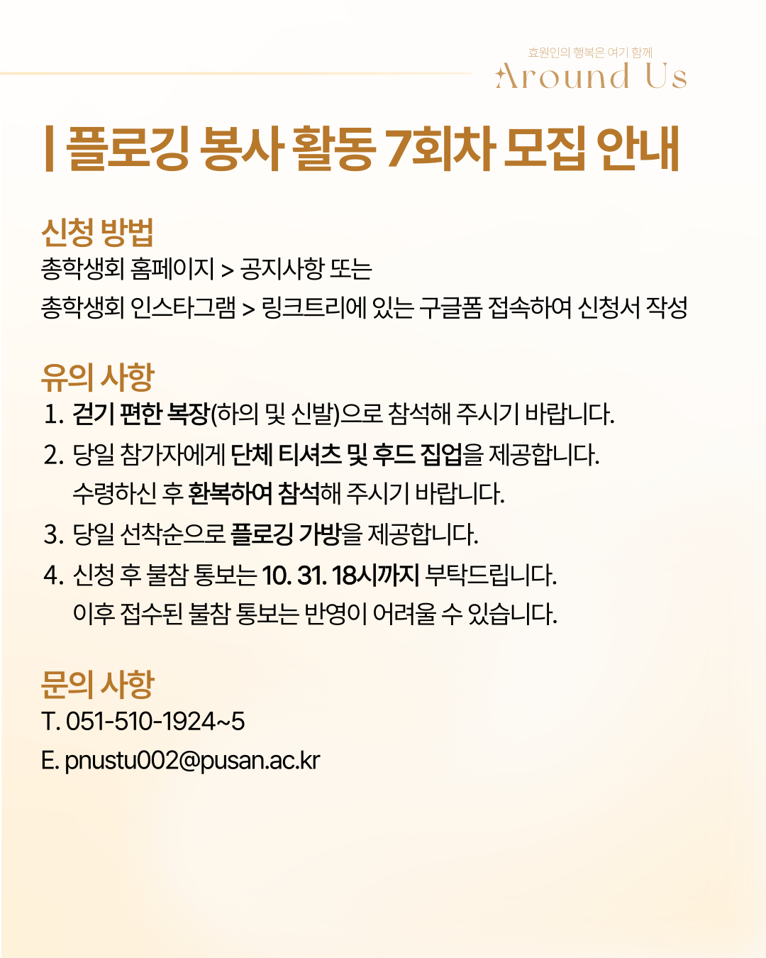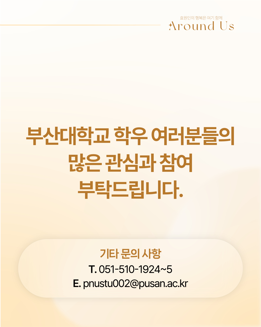 안녕하십니까, 부산대학교 제57대 총학생회 ‘Around Us’ 대외협력국입니다.