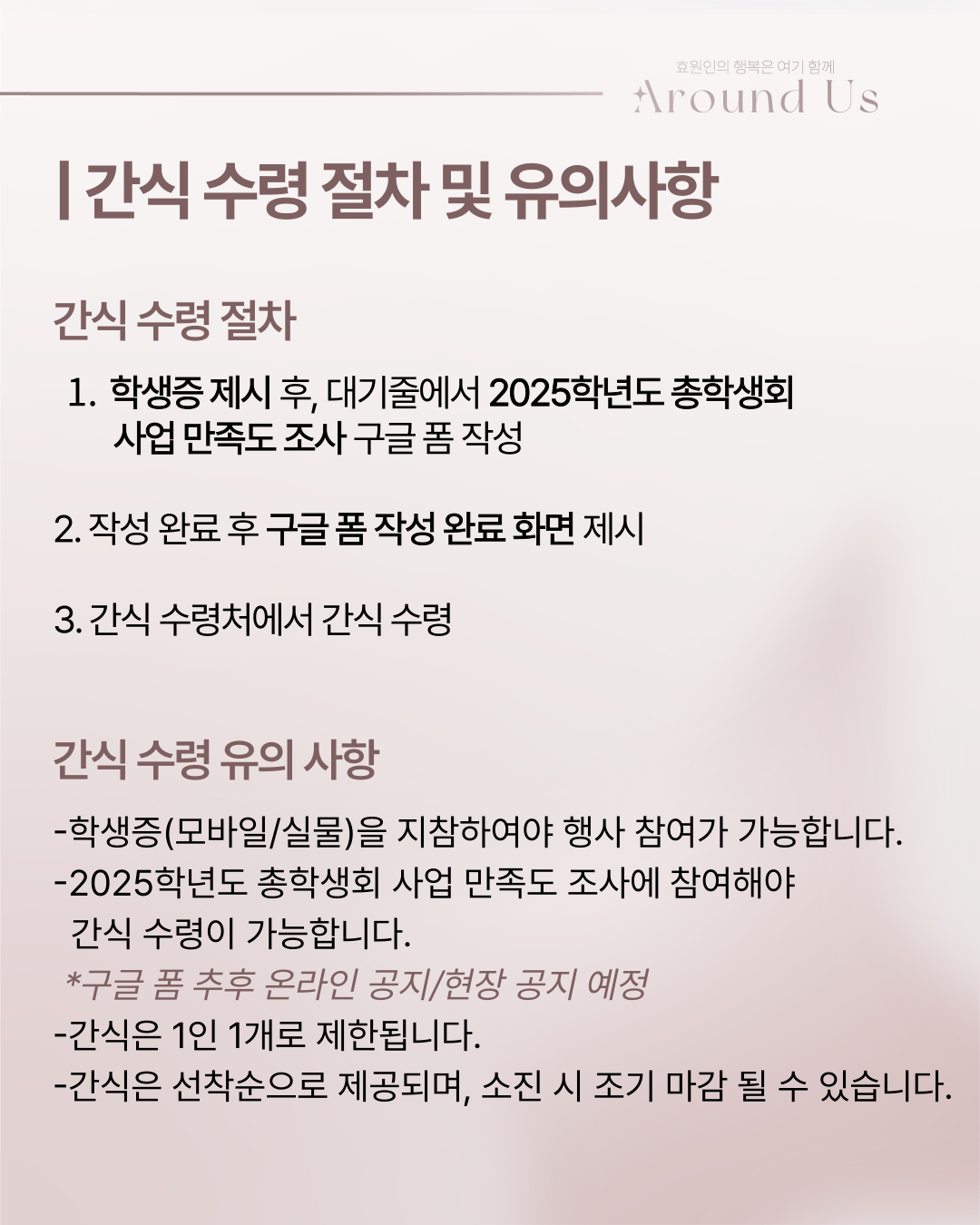 2025년 2학기 기말고사를 앞두고, 열심히 공부하는 학우 여러분들을 위해 2학기 기말고사 간식행사를 준비하게 되었습니다.