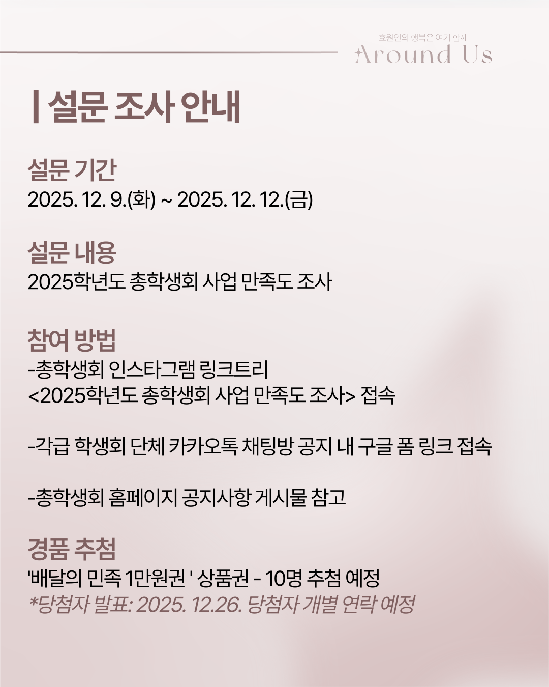 올 한 해 동안 ‘Around Us’ 총학생회가 진행했던 다양한 사업들이 학우 여러분께 어떤 영향을 주었는지, 그리고 학우 여러분들이 향후 새롭게 구성될 총학생회에 바라는 점은 무엇인지 등 학우 여러분들의 소중한 의견을 듣고자 합니다.