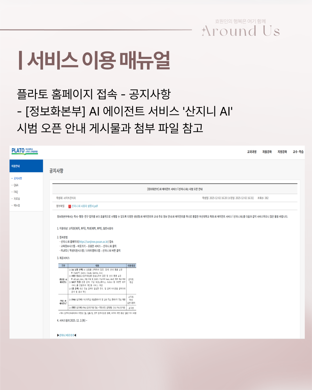 플라토 공지사항- [정보화본부] AI 에이전트 서비스 '산지니 AI' 시범 오픈 안내 게시물 참고 부탁드립니다.